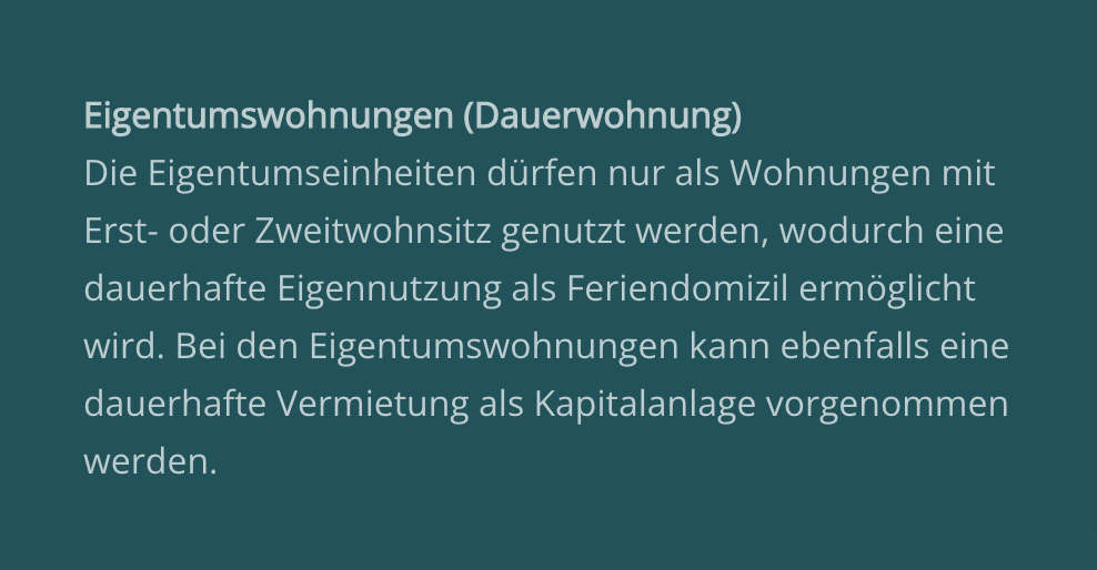 Die Eigentumseinheiten dürfen nur als Wohnungen mit Erst- oder Zweitwohnsitz genutzt werden, wodurch eine dauerhafte Eigennutzung als Feriendomizil ermöglicht wird. Bei den Eigentumswohnungen kann ebenfalls eine dauerhafte Vermietung als Kapitalanlage vorgenommen werden.